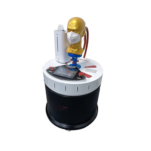 模(mó)擬穿戴預處理機,由呼吸(xī)模擬(nǐ)器、試驗頭模、飽和水蒸氣發生裝置、溫度控製裝置、 流量計等組(zǔ)成,可控製呼吸模擬器以25次/分鍾,每次2L的呼吸量運行。可控製頭模(mó)嘴巴附近飽(bǎo)和水蒸氣的溫(wēn)度為(37+2) °。開啟預處理裝置,使呼吸裝置及飽和水蒸氣發生裝置進入工作狀態(tài),直(zhí)到達到(dào)穩定。將呼氣器以氣密的方式佩戴在匹配的試驗頭模上,測(cè)試20分鍾左(zuǒ)右。從呼吸(xī)器上取下顆粒物過濾材料(liào),然後重新安(ān)裝(zhuāng)上去,繼續(xù)重複測試10次。